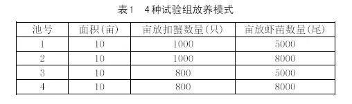 (4)放養(yǎng)模式:至3月12日長江1號(hào)扣蟹全部放齊,5月20日南美白對(duì)蝦苗放齊。設(shè)置4種不同放養(yǎng)密度進(jìn)行試驗(yàn)研究,詳見表1。