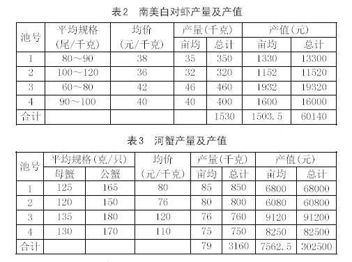 (2)產(chǎn)值:四個(gè)塘口南美白對(duì)蝦和河蟹的總產(chǎn)值362640元。