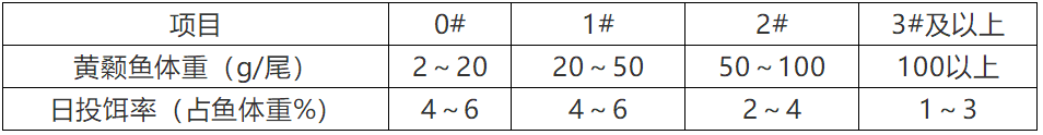 ? 根據(jù)黃顙魚(yú)規(guī)格及數(shù)量,參考投餌參考表中推算投餌量,再根據(jù)天氣、水溫、水質(zhì)、餌料臺(tái)觀(guān)察情況、黃顙魚(yú)攝食及健康狀況等予以適當(dāng)調(diào)整。