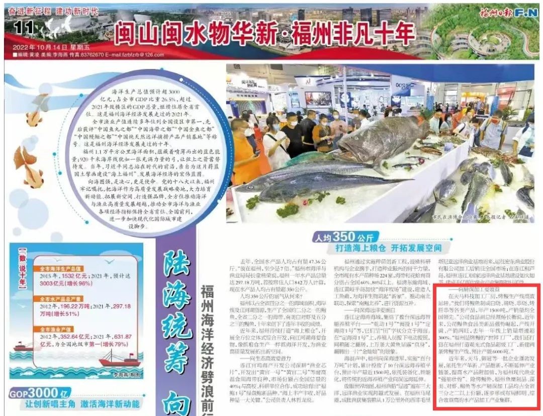 天馬科技訊 10月14日,福州日報刊登專版報道《閩山閩水物華新 福州非凡十年》,報道了天馬科技集團布局鰻魚食品全產業(yè)鏈,以高品質預制菜向精深加工要效益,引領國鰻崛起,引發(fā)了社會的廣泛關注。報道如下↓↓↓